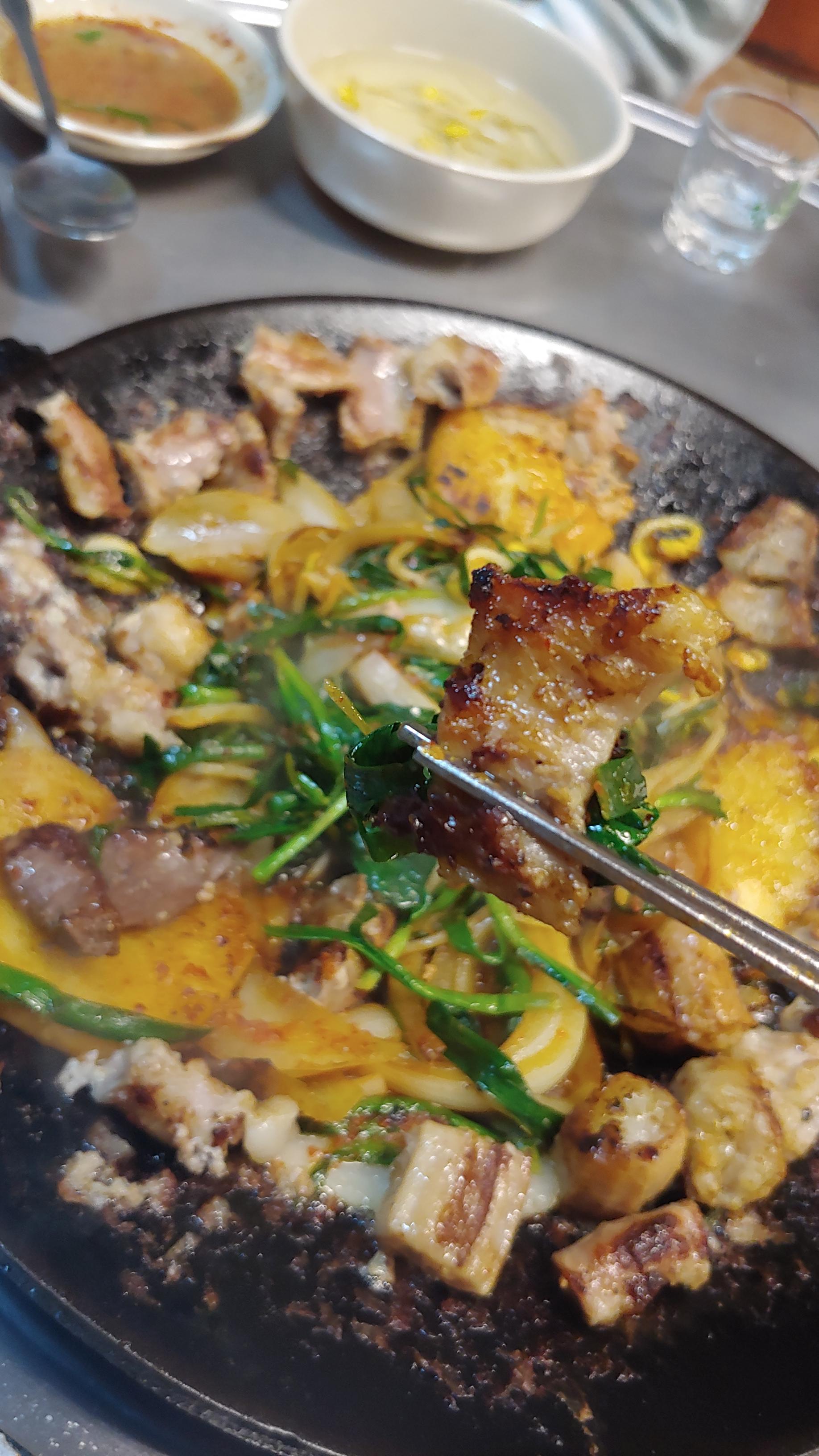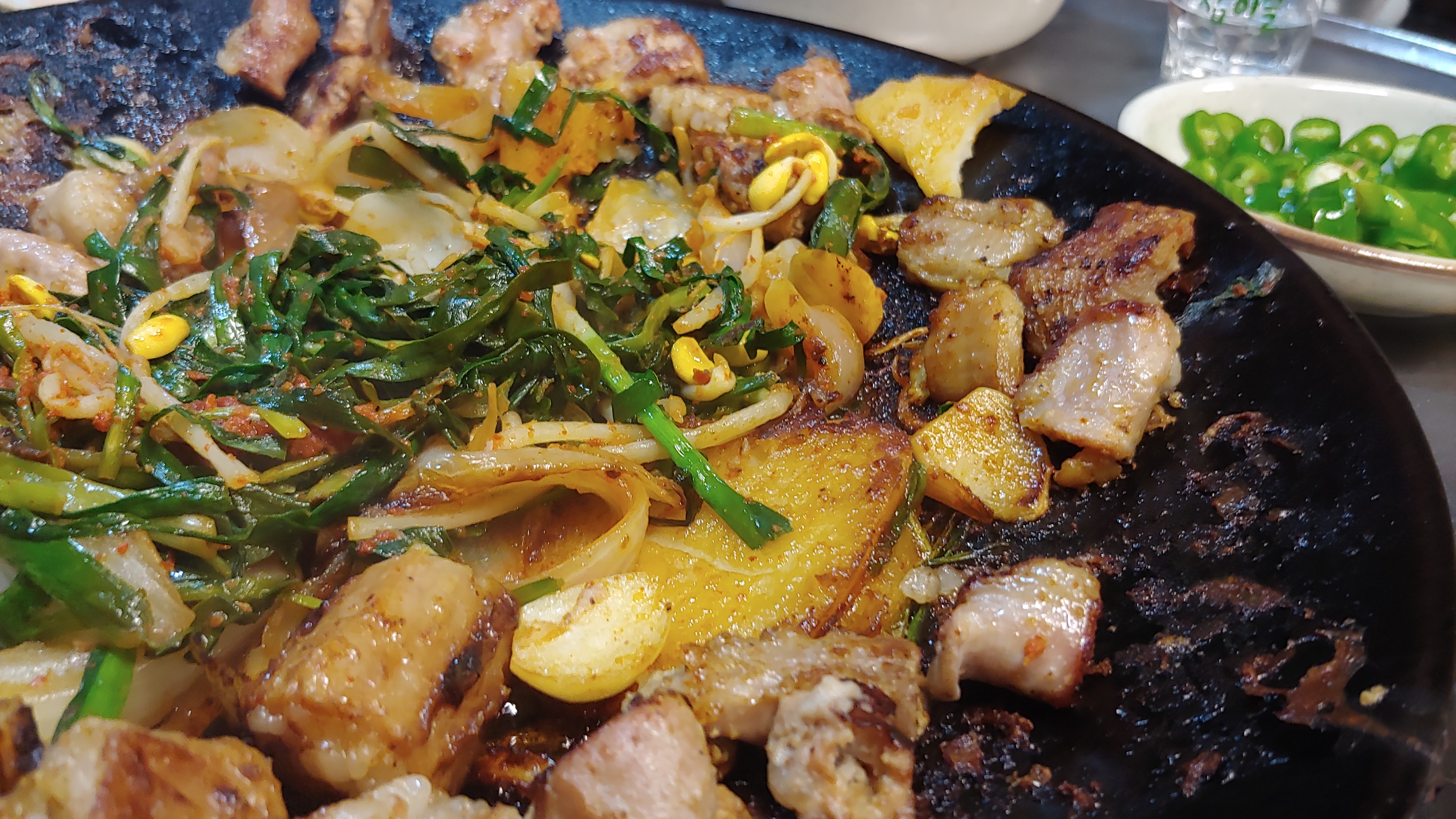 구운 부추와 콩나물과 같이 싸 먹으니 느끼하지도 않고 맛있긴하더라.