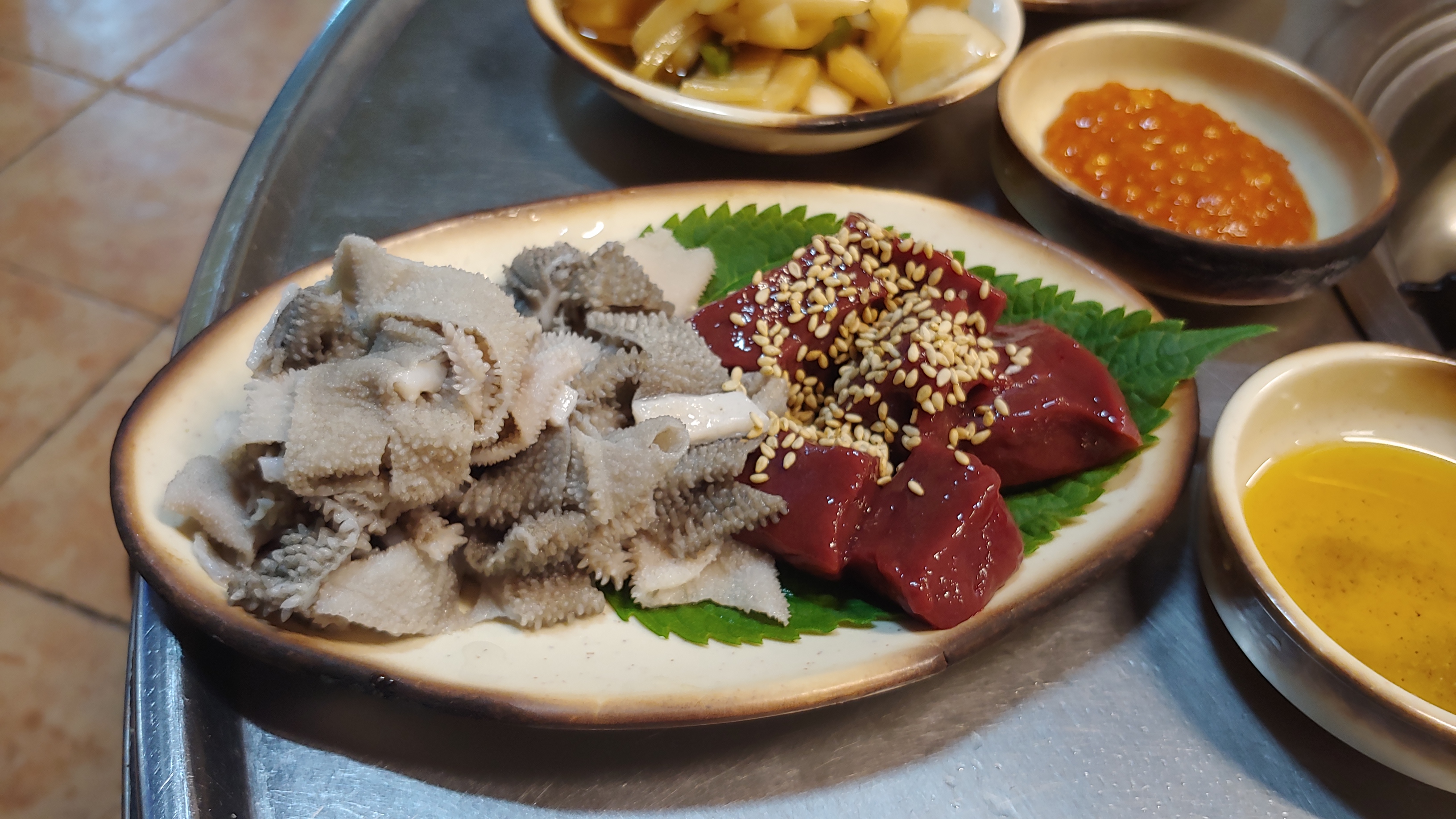 서비스로 간이랑 천엽도 나옴. 요즘 같은 겨울 날씨라서 이렇게 싱싱하게 먹을 수 있음 색깔이 와.......... 진짜 싱싱함.